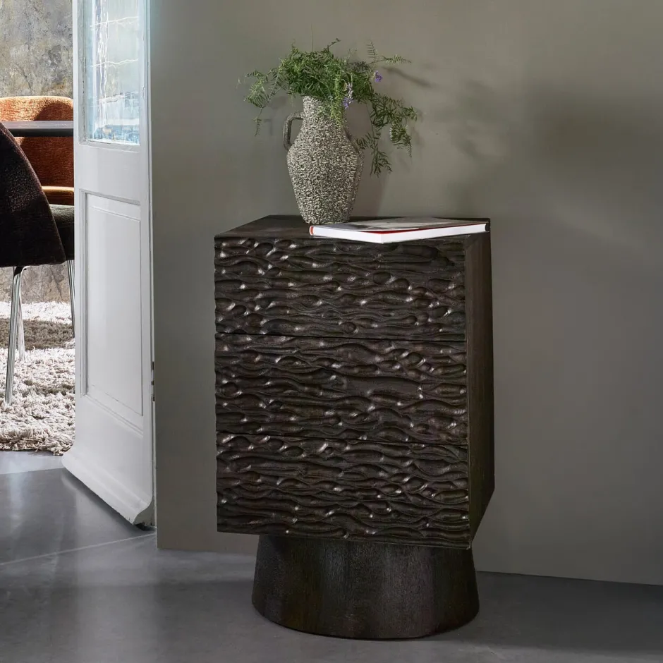 Speels, warm en efficiënt: dat zijn de kenmerken van het Crumble nachtkastje uit de collectie van het Nederlandse interieurmerk WOOOD. Het nachtkastje krijgt een authentieke uitstraling door de speelse structuur en de brede poten. Bovendien is er voldoende ruimte om accessoires te plaatsen op het meubel of om spullen op te bergen in de drie lades.