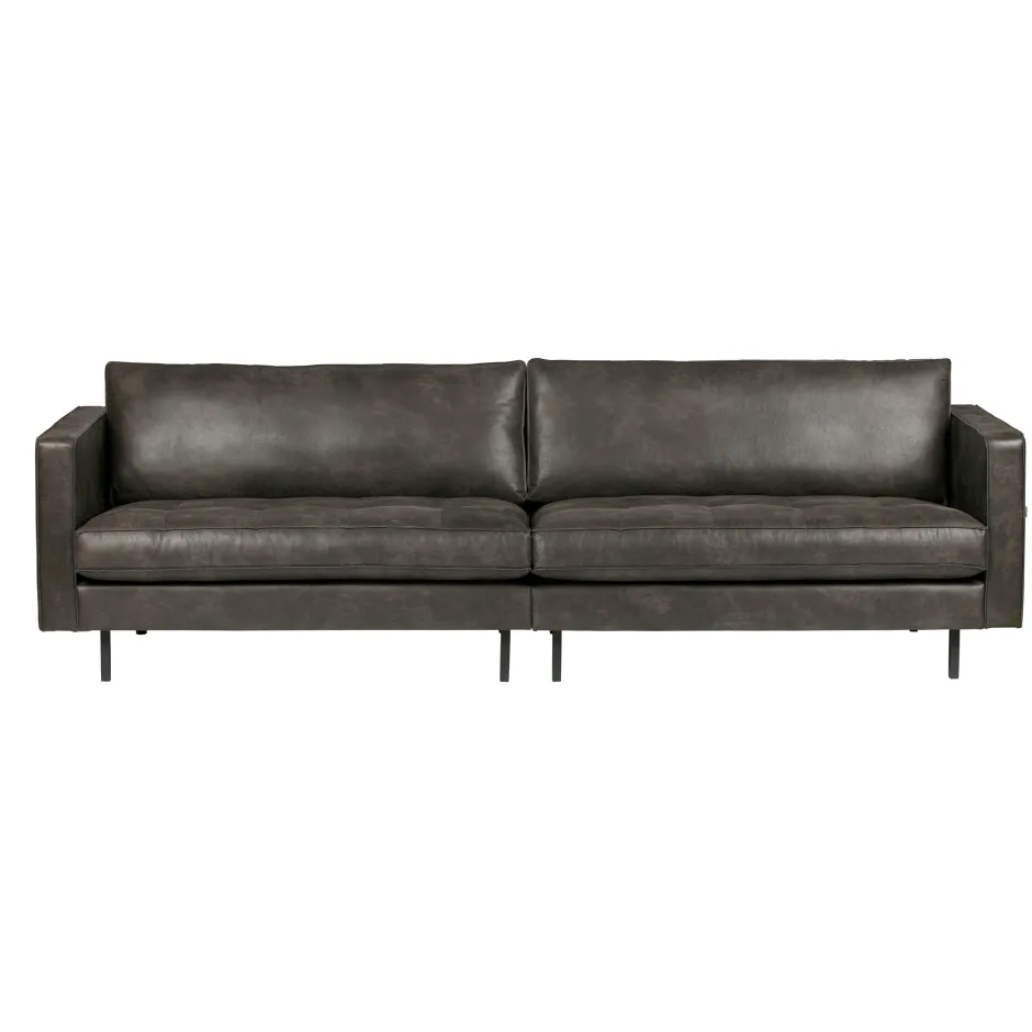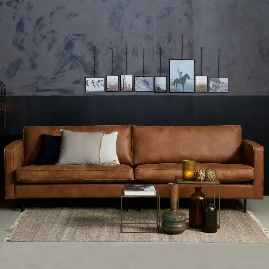 De Rodeo Classic bank is opgebouwd uit een combinatie van massief hout, multiplex, spaanplaat, polyurethaan schuim met een dichtheid van 30 kg/m3 en een zigzag vering. De rugleuning bestaat uit een combinatie van 70% gesneden schuim en 30% siliconen. Deze Rodeo is bekleed met gerecycled leer. Recycle leer geeft een unieke look en is door het gebruik van restanten leer een duurzame keuze! Het recycle leer bestaat uit 70% vezels van echt leer en voor 30% uit polyester. Het materiaal is opgebouwd uit twee onderdelen: de onderlaag bestaat uit gerecycled echt leer, wat zorgt voor de natuurlijke uitstraling. De bovenste laag is een polyester afdeklaag die het leer beschermt en oneffenheden voorkomt. Hierdoor wordt het een stevige combinatiestof. De microvezel is gebreid van zeer kleine, synthetische vezels. Deze productietechniek zorgt voor de stevigheid en een fijn, zacht gevoel. De stof is zeer kleurvast. Tijdens het gebruik zal het uiterlijk en de structuur van de stof zijn natuurlijke kenmerken meer laten zien, dit verandert niks aan de duurzaamheid en kwaliteit.
