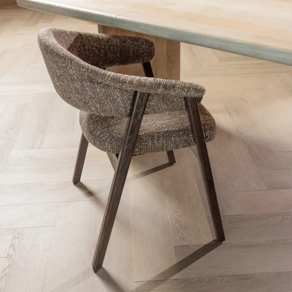 De stoel is gemaakt van FSC gecertificeerd eikenhout. Dit hout kenmerkt zich door de zichtbare hout- en nerftekeningen die elke stoel een uniek karakter geven. Onze Fling geweven stof heeft een zachte en luxe uitstraling. De samenstelling bestaat uit 100% polyester, wat de stof zowel stevig als comfortabel maakt. Met de juiste zorg kan onze Fling geweven stof jarenlang zijn zachte en aantrekkelijke uitstraling behouden. Deze materiaalcombinatie zorgt voor een speelse en warme uitstraling. De stof heeft een Martindale waarde van 25.000, waardoor je met juist onderhoud jarenlang kunt genieten van de mooie kwaliteit.