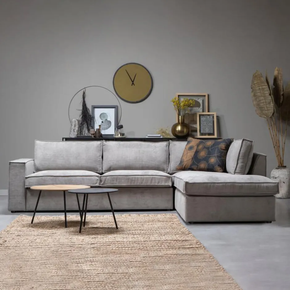 De Thomas hoekbank heeft een basic en warme uitstraling. Deze bank (met de hoek aan de rechterkant) is voorzien van een stevige polyester ribstof (Martindale 45.000) in de kleur vergrijsd groen en past goed in het interieur van nu.