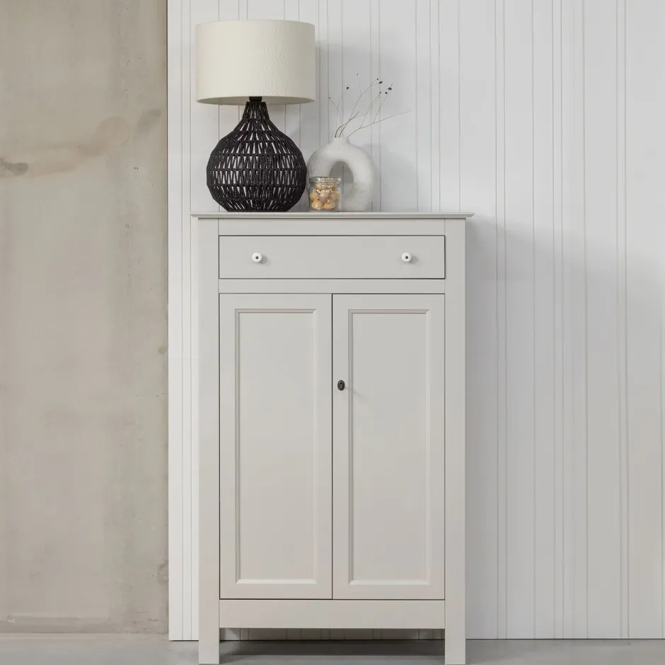De WOOOD wandkast Eva (hxbxd) 150x93x40 cm is een brocante wandkast gemaakt van betongrijs gelakt, FSC gecertificeerd, grenenhout. Deze wandkast Eva is tijdloos en past in elke woonstijl. Het interieur van deze kast is gemaakt van gemêlamineerd spaanplaat en de handige lade bovenin, met 2 porseleinen knoppen, is voorzien van solide metalen ladegeleiders. De binnenkant van de kast is ingericht met 3 brede legplank. De deuren zijn voorzien van solide metalen scharnieren en een slot met sleutel. Deze wandkast Eva is ook in de kleur wit verkrijgbaar.