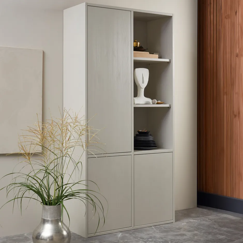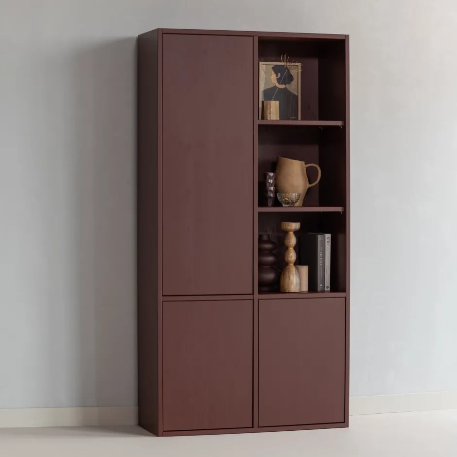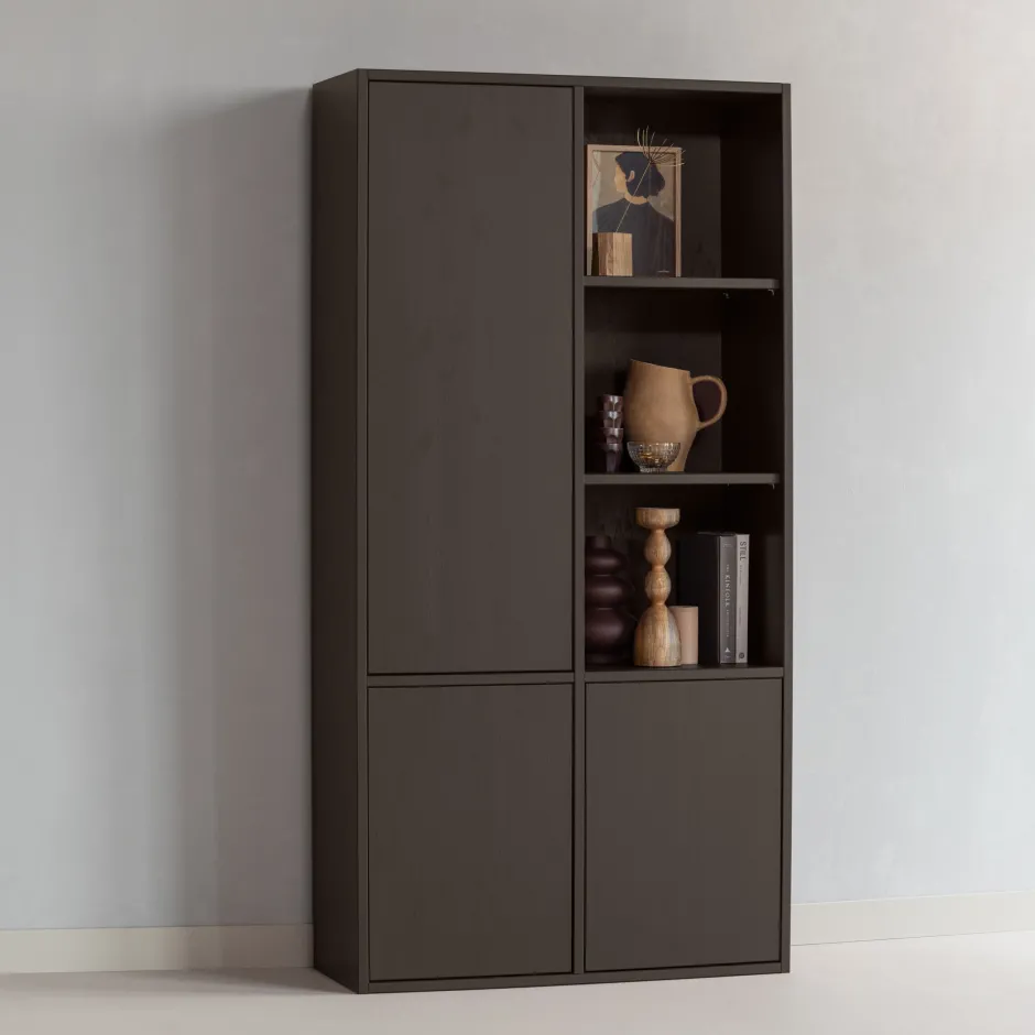 De kast heeft drie deuren waarachter zich ruime planken bevinden, perfect geïntegreerd in het ontwerp. Daarnaast is er een open vakgedeelte met planken dat het ontwerp lucht geeft en ruimte laat voor persoonlijke accenten. Stijlvol, tijdloos en verfijnd, past Merel goed in een modern, Scandinavisch interieur.