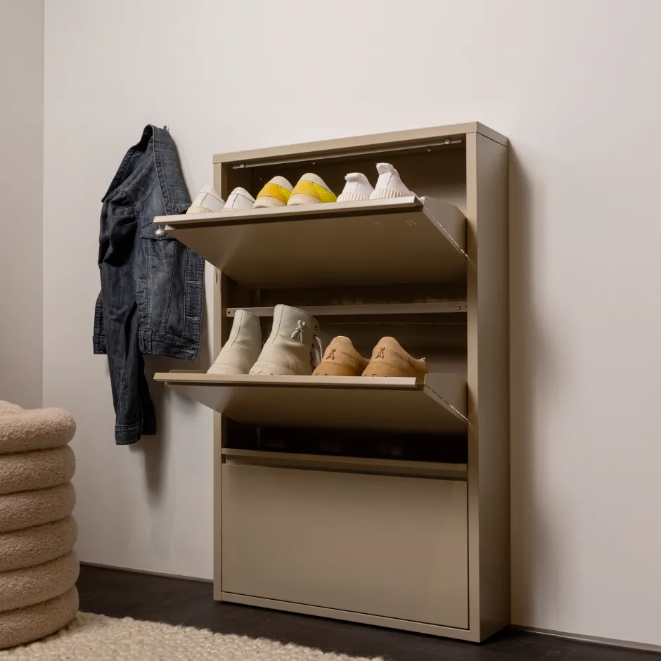 Deze slanke schoenenkast komt uit de collectie van het Nederlandse interieurmerk WOOOD en oogt onopvallend door het greeploze design. De Sabine schoenenkast heeft een drie praktische opbergvakken, ruimte genoeg voor jouw sneakercollectie.