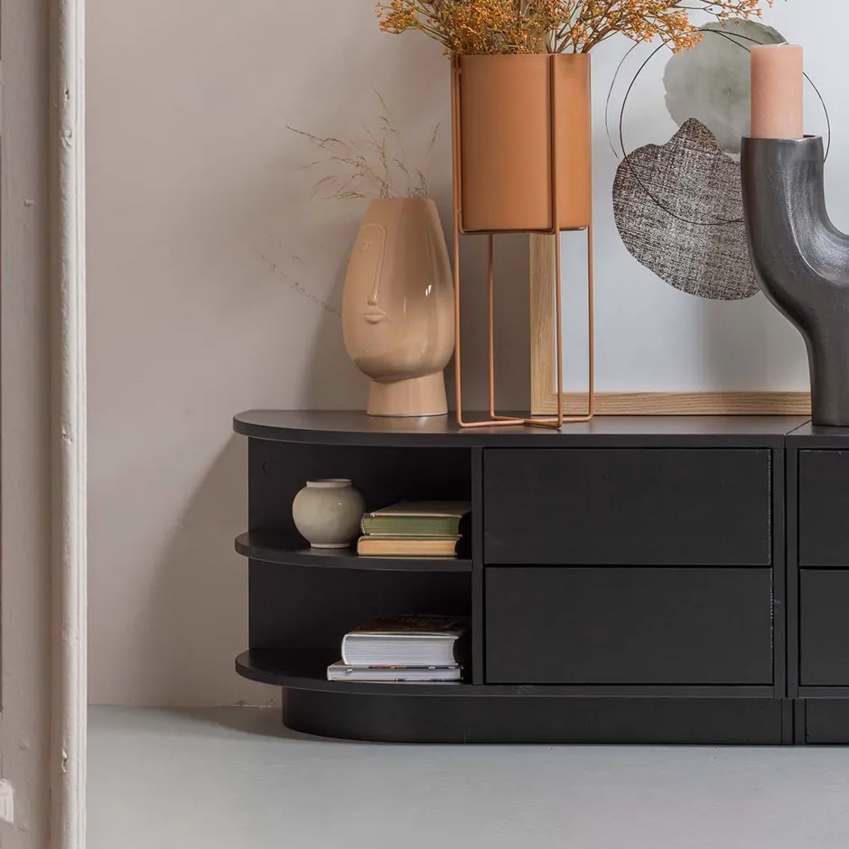 TV-meubel ‘Finca’ van WOOOD Exclusive brengt een moderne en strakke uitstraling naar je interieur. Gemaakt van massief grenenhout en afgewerkt met een stijlvolle matzwarte coating, straalt het meubel eenvoud en elegantie uit. De afgeronde linkerkant met open vakken geeft de kast een speels en uniek karakter. Met twee handige lades met een push-to-open systeem is dit meubel niet alleen mooi, maar ook praktisch.